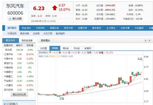 东风汽车与华为宣布双方合作打造的智能化汽车将在4月下旬的车展中正式亮相。受此消息影响,11日早盘,与华为达成战略合作的东风汽车开盘强势涨停,涨幅10.07%,报6.23元/股。在此带动下,汽车指数表现活跃,截至发稿,东风汽车、江淮汽车、一汽夏利三股涨停,长城汽车、福田汽车等纷纷走强。