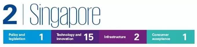 新加坡将该国定位为部署模拟城市试验台和无人驾驶公交车计划的自动驾驶发展中心。政府态度积极、消费者持拥抱程度、优质的道路和移动网络基础设施,让新加坡位列该榜第二。从2014年起,新加坡就开始了面向交通驾驶的公共政策研究,陆路交通管理局 (LTA)对驾驶数据为依据的事故调查和责任索赔提出了要求;2017年,通过了道路交通法修正案,允许自动驾驶汽车进行公共道路测试。