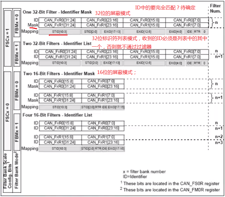 1个32位过滤器,包括:STDID[10:0]、EXTID[17:0]、IDE和RTR位===用于扩展ID(28位)和标准ID(11位)