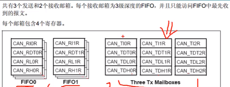 软件需要在一个空的发送邮箱中,把待发送报文的各种信息设置好(然后再发出发送的请求)。发送的状态可通过查询CAN_TSR寄存器获知。