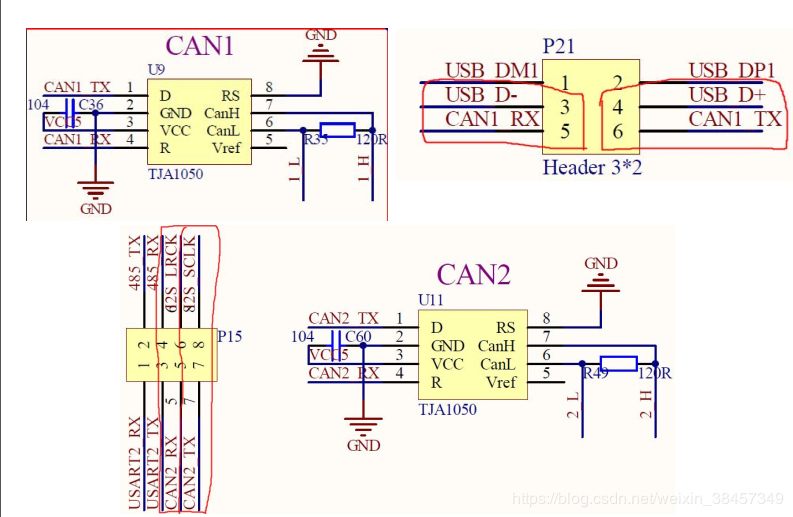 使用启明高配版开发板,因为启明的板子上有两个can可以使用,在调试之前,需要先将can1_H连接can2_H,can1_L连接can2_L,并且需要将P15和P21跳线帽连接好。