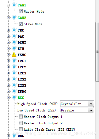 使能RCC,CAN1,CAN2以及开发板的PE3,PE4,PG9,SYS可以选择SW模式。点亮灯主要是想在调试的时候使用方便
