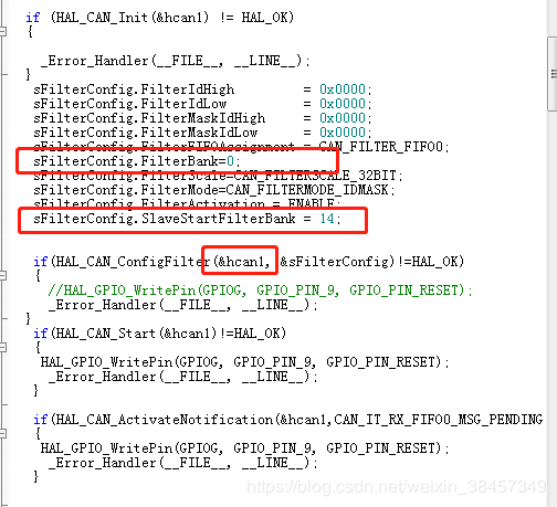 在can的初始化函数中添加对滤波器的配置,SlaveStartFilterBank为从过滤器配置,用来选择从过滤器的寄存器编号。当选择双can模式时,这个参数要跟can2的FilterBank一致。