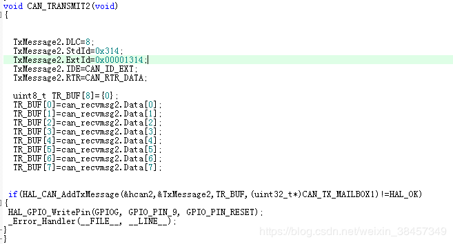以下是CAN_TRANSMIT2,因为我想实现的是can2接收的数据在发回给can1,所以我将can2接收的数据在赋值给can1