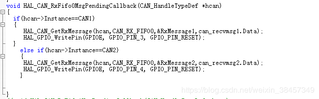 书写回调函数,因为我将can1和can2都绑定在FIFO0上,所以只写了一个回调函数(也可以将can1绑定FIFO0,can2绑定FIFO1,写两个回调函数)