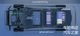 低速时,会有多余的电量产生,这份电量会被储存在电池组里(记住,不是燃料电池组)。高速时燃料电池组和电池组同时放电,来为车子提供动力。