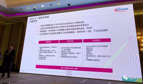 英飞凌REAL3图像传感器可以直接记录深度图和2D灰度图,具有业界最优性能、高度集成、优异性能等优点,并且芯片尺寸小巧,能轻松集成到智能手机、可穿戴设备等小型移动设备中。“不仅仅是ToF图像传感器,英飞凌还提供可靠且完备的REAL3传感器解决方案:摄像头、软件驱动程序、3D深度处理管道、参考设计和定制支持、模组制造商培训和支持资源,以及参考生产装置设置,以便3D模组制造商和原始设备制造商进行校准和测试。”麦正奇先生说道。