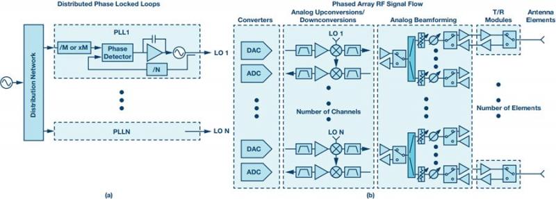 对于任何无线电系统,都需要为接收器和激励器精心设计 LO生成的实现方法。随着数字波束成形在相控阵天线系统中不断普及,需要在大量分布式接收器和激励器中分配 LO 信号和基准频率,这让设计变得更加复杂。