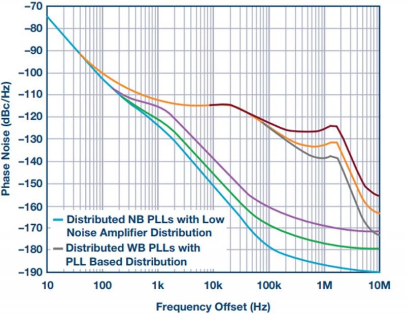 在系统架构层面需要权衡的因素包括,分配所需的LO频率或分配较低的频率基准,以及在靠近使用点的物理位置产生所需的LO。通过锁相环从本地产生 LO 是一种高度集成的现成选项。下一个挑战是评估来自各种分布式组件以及集中式组件的系统级相位噪声。