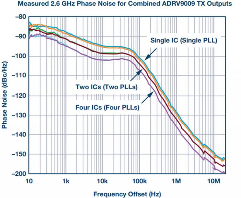 图2所示为针对组合锁相环的测量示例。这些数据是通过组合来自多个 ADRV9009 收发器的发射输出获得的。图中所示为单个 IC、两个组合 IC 和 四个组合 IC 的情况。对于这个数据集,在 IC 组合之后,可以看到明显的 10logN 改进。为了达到这个结果,需要采用一个低噪声晶体振荡器参考源。下一节建模的动机是推导出一种方法,以计算在具有许多分布式收发器的大型阵列中,更广泛地说是在具有分布式锁相环的任何架构中,这种测量结果会如何变化。