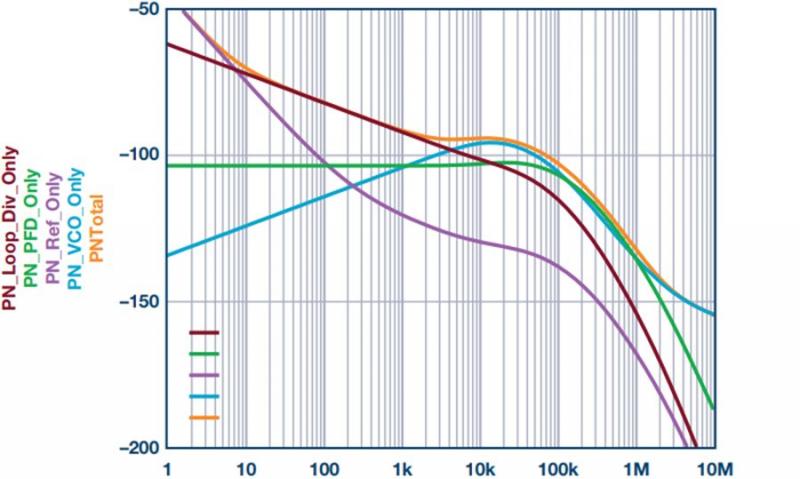 图3. 典型的锁相环相位噪声分析,显示所有组件的噪声贡献。总噪声是所有贡献因素的总和。