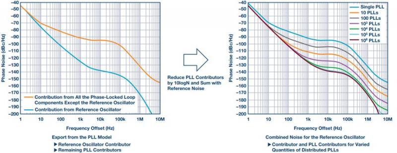 图4. 开始采用分布式锁相环相位噪声建模方法:从锁相环模型中提取参考振荡器和锁相环中除参考振荡器外的所有其他组件的相位噪声贡献。作为分布式锁相环数量的函数,组合相位噪声假设参考噪声是相关的,而分布在多个PLL之间的噪声贡献是不相关的。