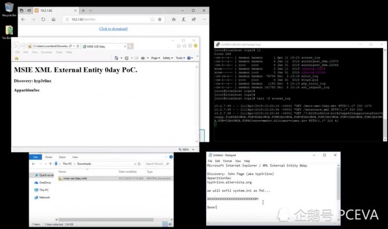 由于微软拒绝为修复该漏洞制定具体的时间表,安全研究人员John Page公开了概念验证代码和攻击演示。视频中一个特制的.MHT文件(单个文件的web档案)成为钓鱼的手段,只要双击这个下载到本地的网页文件,Windows会自动利用默认关联的IE浏览器将其打开,此时电脑中的指定文件内容就会被传送到远程的服务器端。