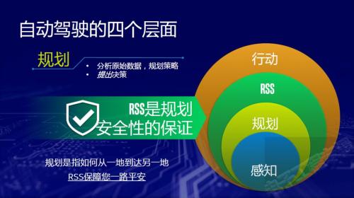 传统意义上的自动驾驶分为三个层面:感知、规划和行动,RSS介于规划和行动层之间,是一种开放、透明的行业标准,为自动驾驶汽车决策过程提供可验证的安全保障(图:Mobileye , An Intel Company)