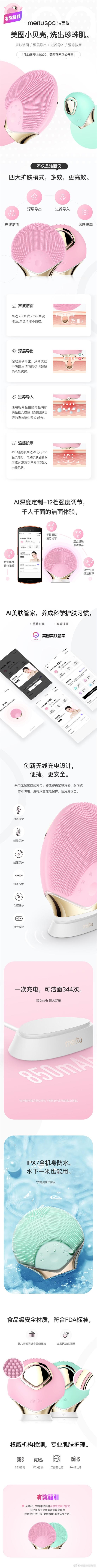 与此同时,美图并没有放弃硬件,而是推出了一款全新的美肤智能新品“meituspa洁面仪”(小名:美图小贝壳),首次提出“AI美肤”概念,这款洁面仪将会在4月23日于美图官网正式开售,售价为598元。