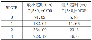 根据上面的公式,假设 Fpclk1=45Mhz,那么可以得到最小-最大超时时间表如表 11.1.1 所示