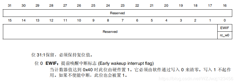 ● 提前唤醒中断 (EWI):当递减计数器等于 0x40 时触发(如果已使能且看门狗已激活)