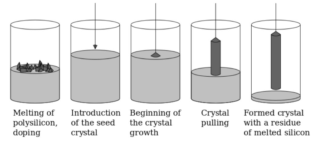 接下来是单晶硅生长工艺。就是从硅熔体中生长出单晶硅。高纯度的多晶硅放在石英坩埚中,在保护性气氛中高温加热使其熔化。使用一颗小的籽晶缓慢地从旋转着的熔体中缓慢上升,即可垂直拉制出大直径的单晶硅锭。