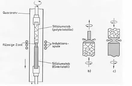 这种方法是利用热能在半导体多晶棒料的一端产生一熔区,使其重结晶为单晶。使熔区沿一定方向缓慢地向棒的另一端移动,进而通过整根棒料,使多晶棒料生长成一根单晶棒料,区熔法也需要籽晶,且最终得到的柱状单晶锭晶向与籽晶的相同。