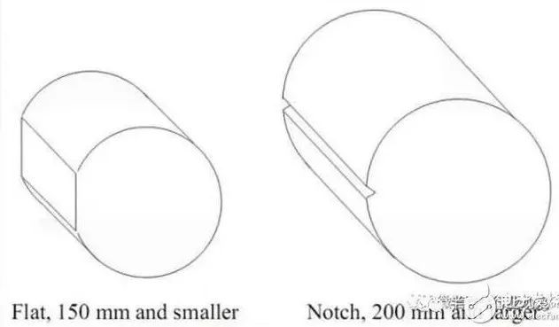 在硅棒做出来后,在200mm以下的硅棒上是切割一个平角,叫Flat。在200mm(含)以上硅棒上,为了减少浪费,只裁剪个圆形小口,叫做Notch。最后再进行切片,得到的晶圆如下。