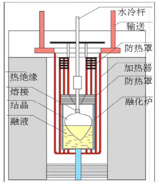 区熔法与直拉法最大的不同之处在于:区熔法一般不使用坩锅,引入的杂质更少,生长的材料杂质含量也就更少。