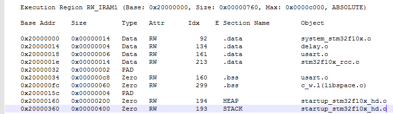 可以看到每个文件所使用的SRAM大小,比如delay文件使用了4个字节,地址从0x20000014到0x20000017。其中可以看到HEAP和STACK占了大头,分别占了0x00000200和0x00000400的空间。STACK的起始地址是0x20000360,大小是0x00000400,那么最后的地址是0x20000760,刚好等于1888=0x760字节。于是我们就知道SRAM空间用来存放了什么东西了:1、各个文件中声明和定义的全局变量、静态数据和常量;2、HEAP区;3、STACK区。