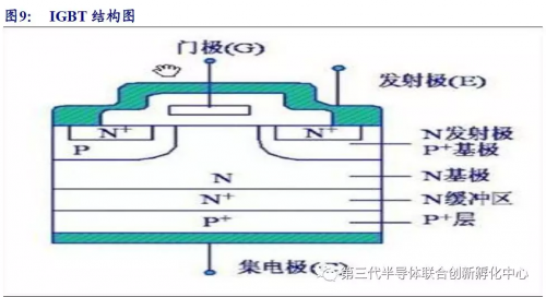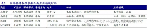 绝缘栅双极型晶体管,是由 BJT(双极型三极管)和 MOS(绝缘栅型场效应管) 组成的复合式半导体。IGBT 兼具 MOS 和 BJT 的优点,导通原理与MOSFET 类似, 都是通过电压驱动进行导通。IGBT 在克服了 MOSFET 缺点,拥有高输入阻抗和低 导通压降的特点,在高压环境下传导损耗较小。IGBT是电机驱动的核心,广泛应 用与逆变器、变频器等,在 UPS、开关电源、电车、交流电机等领域,逐步替代 GTO、GTR 等产品。IGBT 的应用范围一般都在耐压 600V 以上,电流 10A 以上, 频率 1KHz 以上的区域。IGBT 固有结构导致其作为高频开关时损耗较大,IGBT 工 作频率通常为 40-50KHz。IGBT 的导通与阻断都受电压控制,可以双向导通。