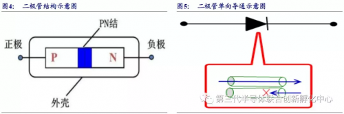 二极管是最简单的功率器件,由 P 极和N 极形成 PN 结结构,电流只能从 P 极流向 N 极。二极管由电流驱动,无法自主控制通断,电流单向只能通过。二极管的作用有整流电路、检波电路、稳压电路和各种调制电路。二极管承受的电压和电流较低(锗管导通电压为 0.3V,硅管为 0.7V),电流一般不超过几十毫安,电压和电流过高会导致二极管被击穿。常见的二极管有肖特基二极管、快恢复二极管、 TVS 二极管等。