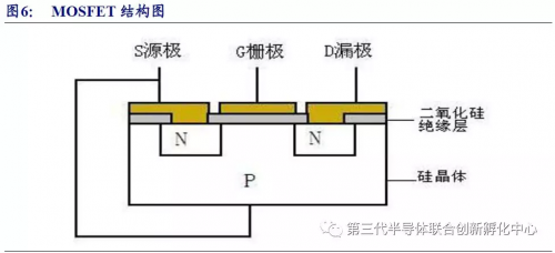 MOSFET 由 P 极、N 极、G 栅极、S 源极和 D 漏级组成。金属栅极与 N 极、P 极之间有一层二氧化硅绝缘层,电阻非常高。不断增加 G 与 S 间的电压至一定程度,绝缘层电阻减小,形成导电沟道,从而控制漏极电流。因此 MOSFET 是通过电压 来控制导通,在 G 与 S 间施加一定电压即可导通,不施加电压则关断,器件通断 完全可控。MOSFET 的优点是开关速度很高,通常在几十纳秒至几百纳秒,开关 损耗很小,通常用于开关电源,缺点是在高压环境下压降很高,随着电压上升电阻变大,传导损耗很高。MOSFET 的导通与阻断都由电压控制,电流可以双向通过。