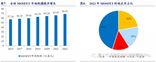 MOSFET 是功率器件最大市场。MOSFET在功率器件中占比最高,2018 年全 球 MOSFET 市场规模为 59.61 亿美元,占功率器件市场的 39.78%。MOSFET 的优 点在于稳定性好,适用于 AC/DC 开关电源、DC/DC 转换器,因此 MOSFET 通常 用于计算机、消费电子、汽车和工业等领域。Yole 预测到 2022 年MOSFET 下游应 用中,汽车占比为 22%,计算机及存储占比为 19%,工业占比为 14%。