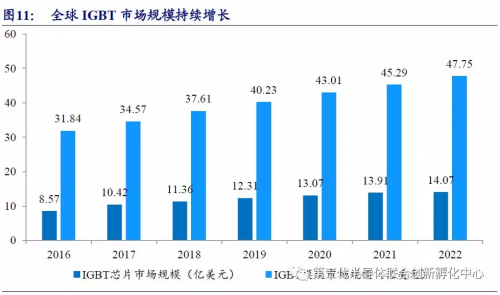 IGBT分为IGBT芯片和IGBT模块,其中IGBT模块是由IGBT芯片封装而来,具有参数优秀、最高电压高、引线电感小的特点,是 IGBT 最常见的应用形式,IGBT模块常用于大电流和大电压环境。根据 ASMC 的数据,2018年全球 IGBT 芯片市 场规模为 11.36 亿美元,IGBT 模块市场规模为 37.61 亿美元,总计 48.97 亿美元, 占功率器件市场的 32.68%。