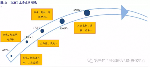 IGBT 应用:IGBT 的应用领域非常广泛,小到家电、数码产品,大到航空航天、高铁等领域,新能源汽车、智能电网等新兴应用也会大量使用 IGBT。按电压 需求分类,消费类电子应用的 IGBT 电压通常在 600V 以下,太阳能逆变器需要 1200V 的低损耗 IGBT,动车使用的 IGBT 电压在 1700V 至6500V 之间,智能电网 应用的 IGBT 通常为3300V。