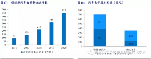 电动汽车将搭载大量新的功率模块,拉动功率半导体快速发展。电动汽车将新 增大量与电池能源转换相关的功率半导体器件,功率半导体应用大幅上升。根据麦肯锡统计数据,纯电动汽车的半导体成本为 704 美元,比传统汽车 350 美元高出近 1 倍,其中功率半导体的成本为 387 美元,占总成本的 55%。