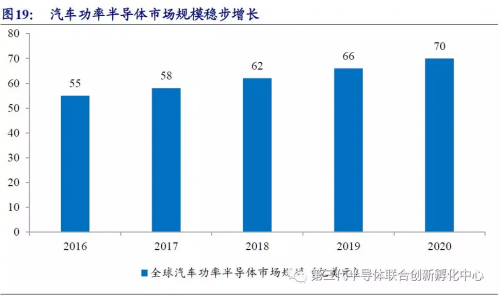 全球汽车功率半导体市场规模稳步增长。根据中商产业研究院、英飞凌数据, 2017年全球汽车功率半导体市场规模为58亿美元,预计到2020年达到70亿美元,复合增长率 6.47%。