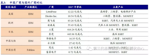 功率半导体厂商大多有完整的晶圆厂、芯片制造厂和封装厂,英飞凌、安森美 等龙头企业均为IDM 模式,对成本和质量控制能力很强,实力强劲。欧美日的功 率半导体厂家大多是 IDM 模式,以高端产品为主;中国大陆的厂商大多也是 IDM 模式,产品以低端二极管和低压 MOSFET 为主,实力较弱;中国台湾以 Fabless 模 式为主,主要负责芯片制造和封装。