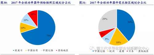 从供给端来看,全球功率半导体的主要产地集中在欧美日,当地厂商拥有先进 的技术和良好的成本管理能力,是 IGBT 和中高压 MOSFET 的主要制造商,占据 全球功率半导体 70%的市场份额。其次是中国台湾,中国台湾的厂商从代工向设计 的方向发展,与欧美日仍然有一定差距,目前占据全球 10%的市场份额。中国大陆 以二极管、低压 MOSFET、晶闸管等低端功率半导体为主,目前实力较弱,占据全球 10%的市场份额。