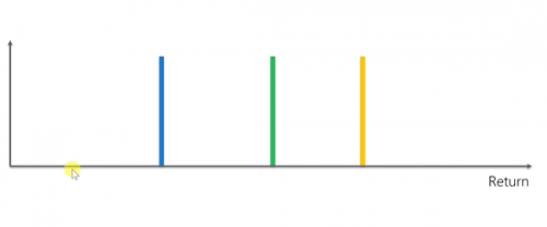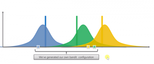 在算法开始前,我们是什么都不知道的,因此需要得到一些基础数据。图中有四个蓝色的数据,表示按下蓝色老虎机得到的奖励,根据这几个得到的奖励,可以得到一个数学分布。同样绿色的老虎机也能得到一个分布,黄色同理。