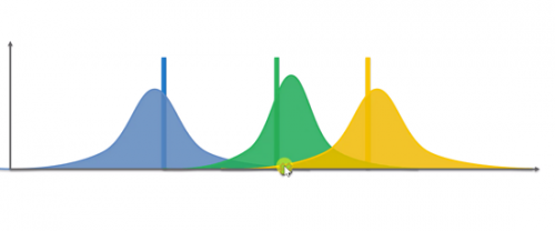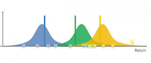 这三个分布预测的是这三个机器给我们带来奖励实际上可能的数学期望的概率分布。接下来基于这三个随机分布,我们得到几个随机抽样,选择获得最大抽样值的机器按下去。但由于是随机的,虽然黄色的实际期望是最高的,但我们依然可能会选出一个绿色大于黄色数据结果。