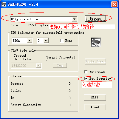 双击桌面上的SAM-PROG v2.4图标 ,运行SAM-PROG v2.4烧录软件,按下图所示进行设置。