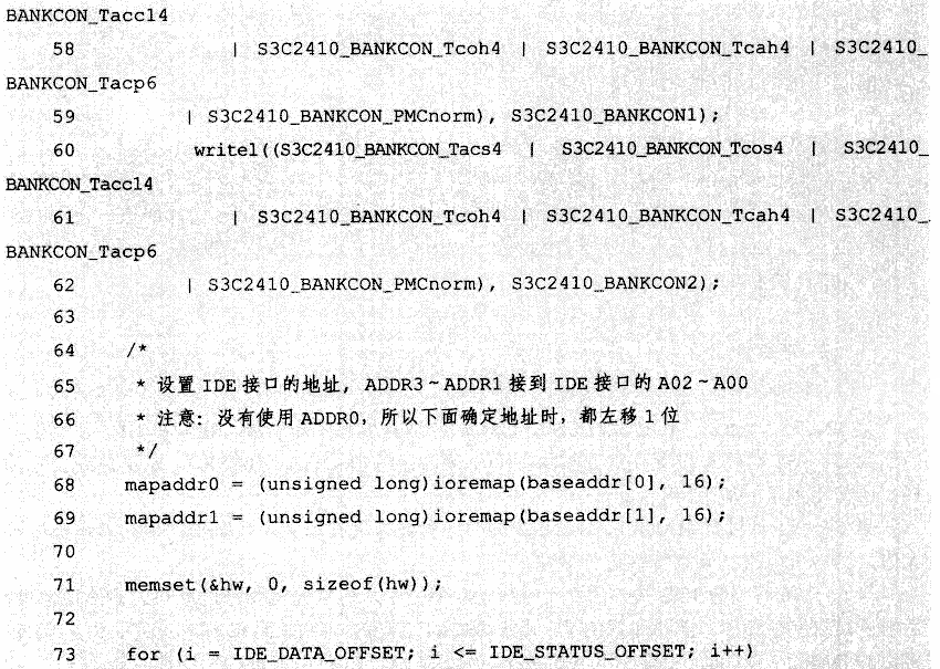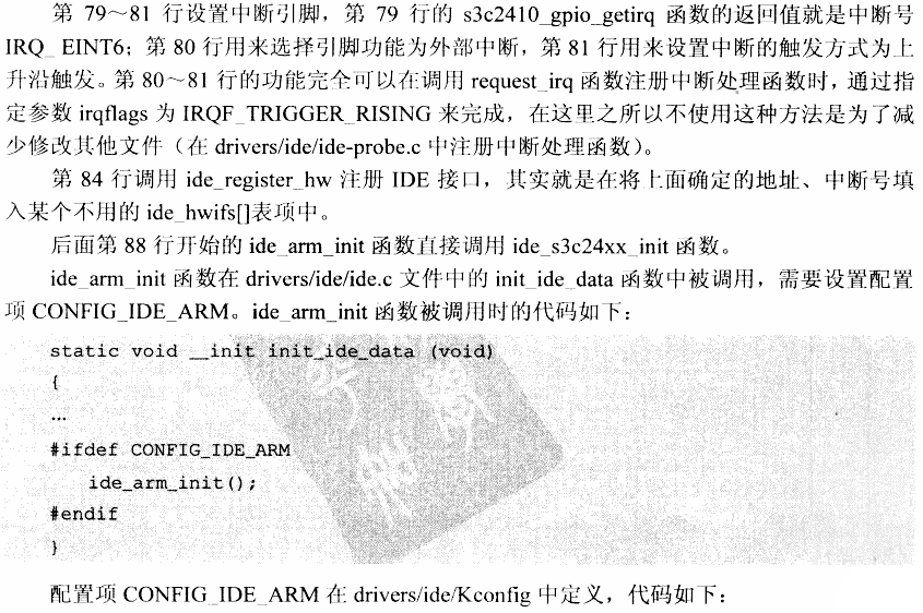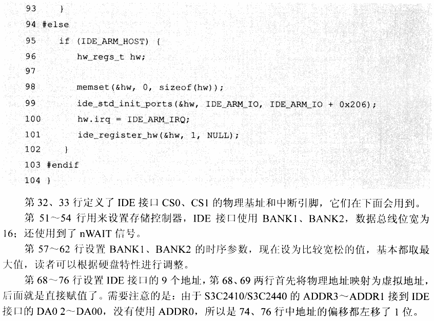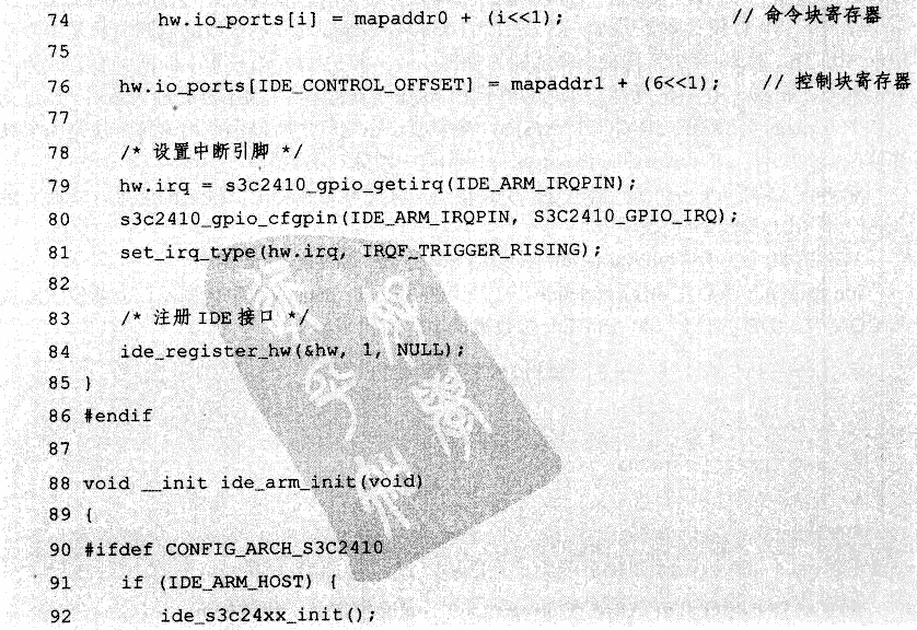 在drivers/ide/arm/ide_arm.c文件中增加ide_s3c24xx_init函数,修改后文件如下(使用编译开关CONFIG_ARCH_S3C2410包含起来的代码是新加的):