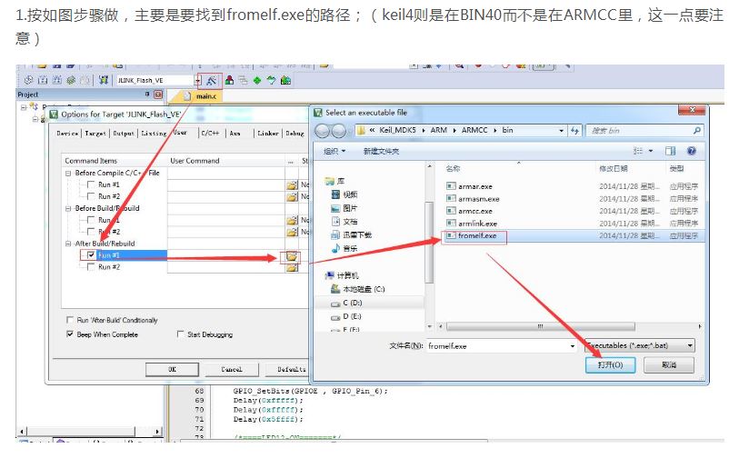 这一步是在user里面填写的。选中fromelf.exe后打个空格键,在后面总共填入如下信息,
