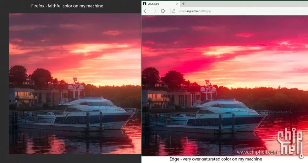 缺乏色彩管理的环境下不正确使用广色域显示设备看到的偏色问题(左:正常;右:偏色;图片来自网络)