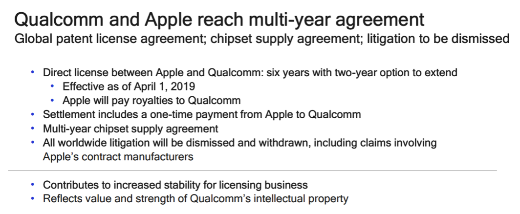 根据最新的和解协议,这份为其六年的直接许可授权自2019年4月1日生效,苹果将会支付高通授权费用,该协议带有两年的延期选项,也就意味着这是一份“6+2”年的直接授权许可协议。