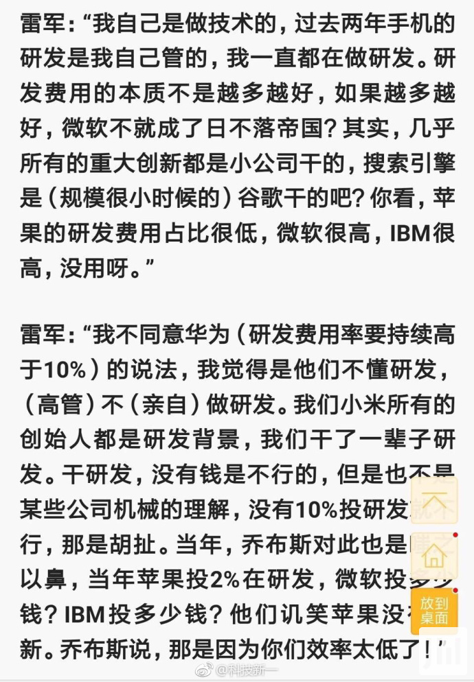 雷军不同意华为研发费用率要持续高于10%的说法,那是不懂研发。当年,乔布斯对此也是嗤之以鼻,苹果投2%在研发,别人的效率太低了!