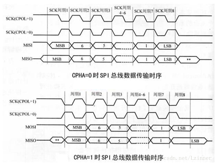CPHA为时钟相位,可以配置为1/0,控制数据的采样方式,设置为0的时候,控制在时钟周期的第一个跳变沿进行数据采集,设置为1的时候在第二个跳变沿进行采集