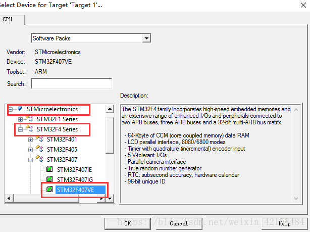 三、接下来会出现一个选择 Device 的界面,就是选择我们的芯片型号,我们选择STM232F407ZE(如果使用的是其他系列的芯片,选择相应的型号就可以了)特别注意: 一定要安装对应的器件支持包才会显示这些内容)。