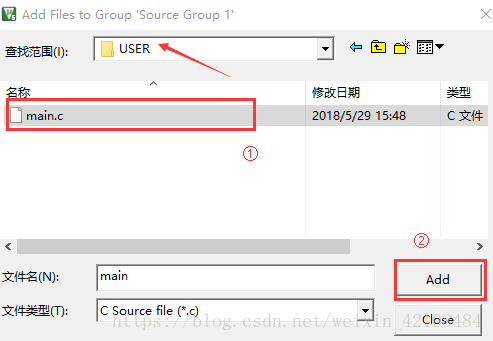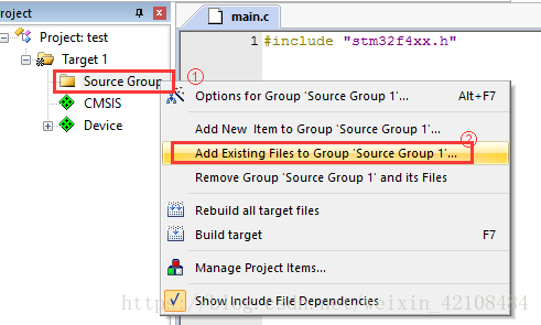 六、将新建的源文件添加到工程中去:右键Source Group--》Add Exitsting File......,再然后定位到USER里面,选择main.c将它添加进去