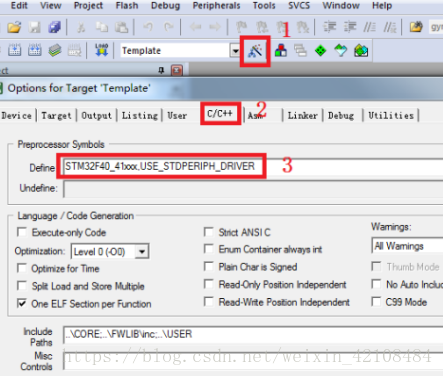 七、如果是STM32F40 系列的工程,还需要添加一个全局宏定义标识符。添加方法是点击魔术棒之后,进入 C/C++选项卡,然后在 Define 输入框连输入:STM32F40_41xxx,USE_STDPERIPH_DRIVER。注意这里是两个标识符 STM32F40_41xxx和 USE_STDPERIPH_DRIVER,他们之间是用英文的逗号隔开的,请大家注意。