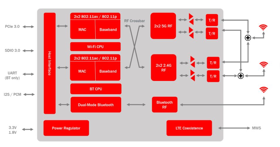 针对互联汽车市场,Marvell推出了业界首款802.11ax Wi-Fi无线连接解决方案88Q9098。该SoC满足汽车行业AEC-Q100 2级要求,集成2x2 加 2x2 同步双 Wi-Fi、双模蓝牙 5/ 蓝牙低功耗 (BLE) 和 802.11p ,并支持千兆级数据传输。由于这种无线连接组合设备专为汽车设计,而非采用现有以消费者为目标的 SoC 并进行重新利用,因此它能更好应对汽车操控的严苛需求。其工作温度范围为 -40°C 至 +105°C,并集成了一系列保护机制,以应对静电放电 (ESD) 冲击和电磁干扰 (EMI)。其他的重要功能还包括瞬时雷达探测,如果雷达信号出现在一个已被占用的信道上,则会将其快速移到另一个信道上,并通过椭圆曲线加密 (ECC) 进行对称加密,从而保护数据流免受黑客的威胁。 图:88Q9098 功能框图