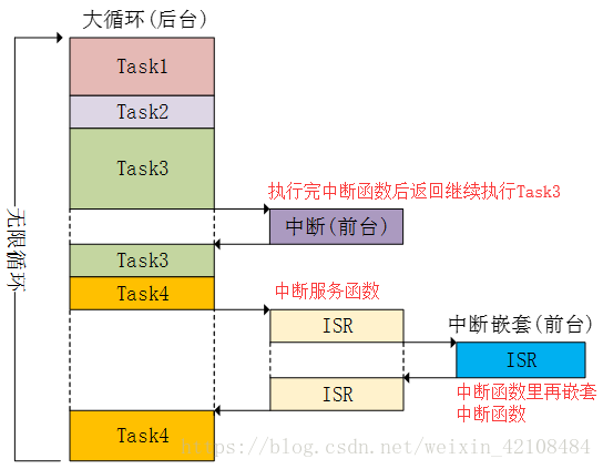 简单的小系统通常是前后台系统,这样的程序包括一个死循环和若干个中断服务程序:应用程序是一个无限循环,循环中调用API函数完成所需的操作,这个大循环就叫做后台系统。中断服务程序用于处理系统的异步事件,也就是前台系统。